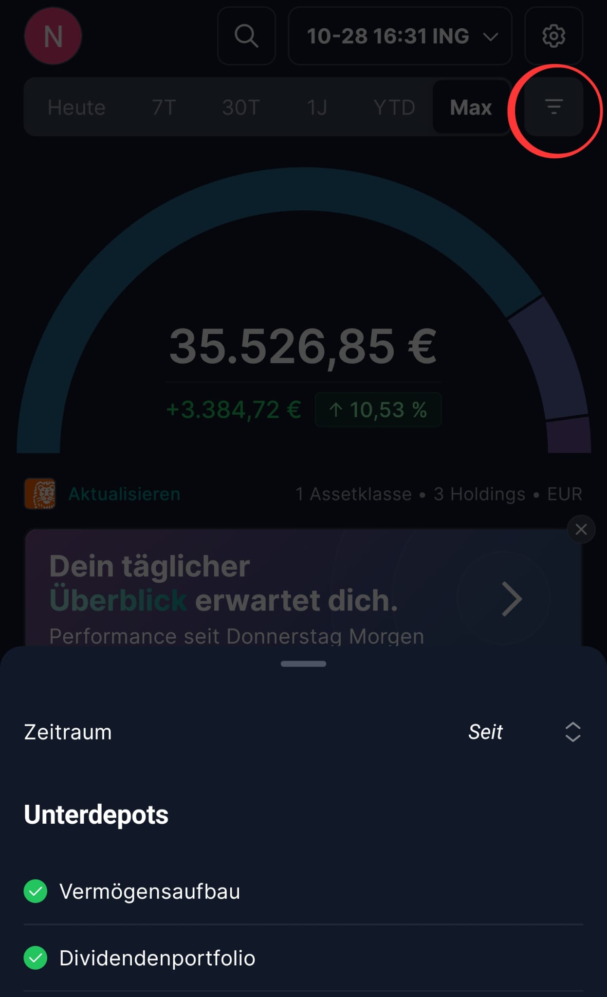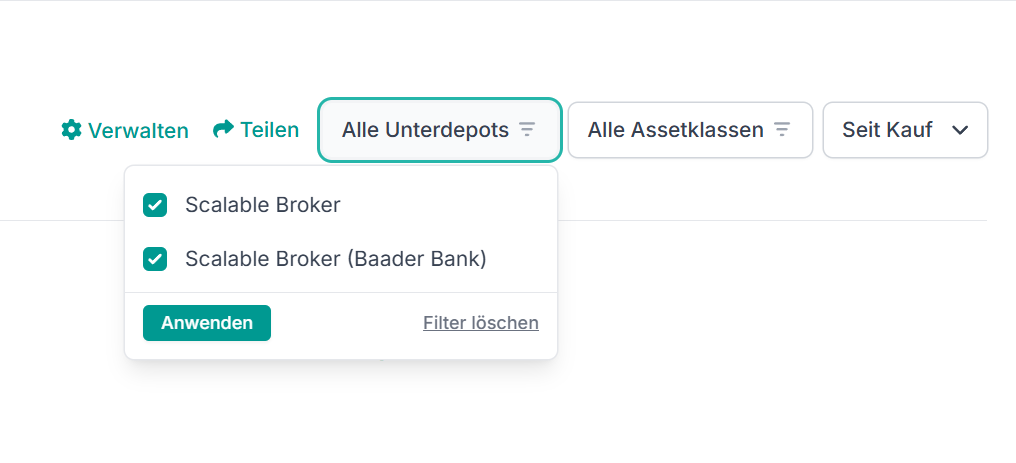 Durch einen neuen Filter lassen sich Unterdepots ein- und ausblenden. Das ist besonders nützlich, wenn du dein Hauptdepot, Zweitdepot oder Juniordepot getrennt betrachten möchtest. Den Filter findest du in der Webapp oben rechts bei den sonstigen Filtereinstellungen für Assetklassen und den Zeitraum: