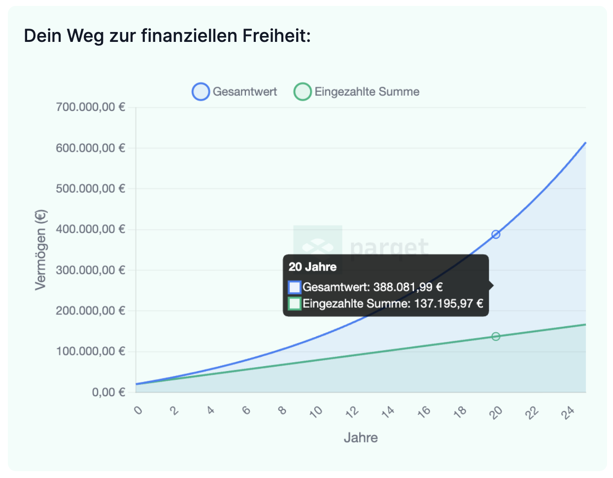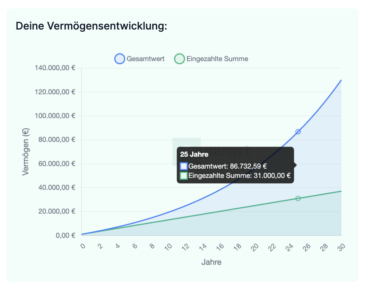 Das Ergebnis kannst du wieder in Zahlen oder auch als Chart deines Vermögens über die Zeit anzeigen lassen: