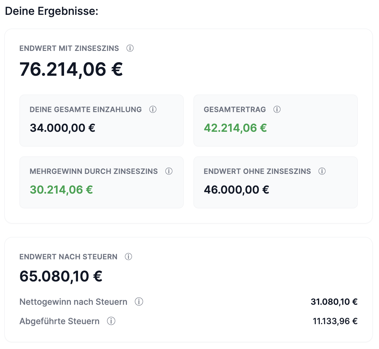 Er visualisiert die Macht des regelmäßigen Investierens und zeigt Dir, wie sich selbst kleine, aber konsistente Sparbeiträge über die Zeit zu einem beachtlichen Vermögen aufsummieren können. Du kannst verschiedene Szenarien durchspielen, um die Auswirkungen von Renditeänderungen oder höheren Sparraten sofort zu erkennen.