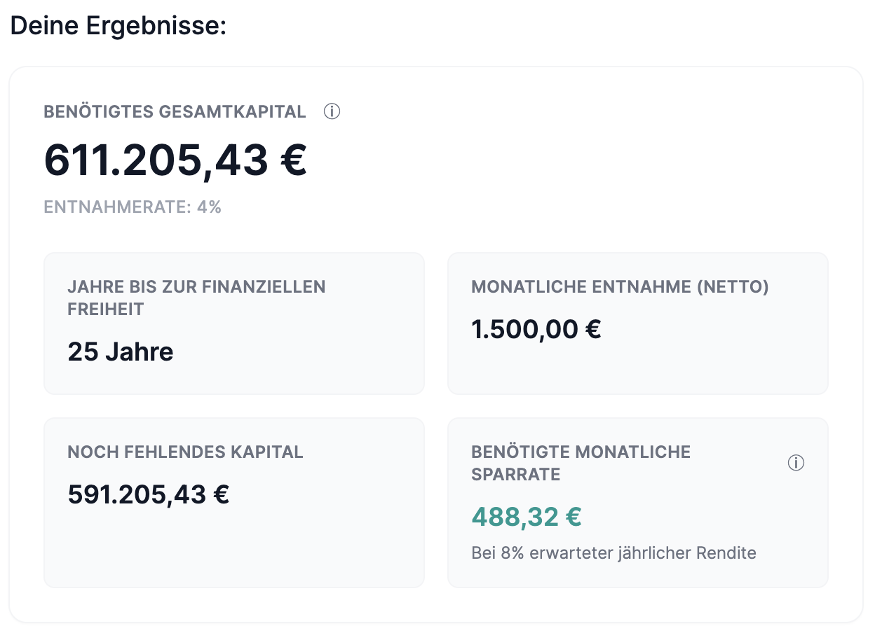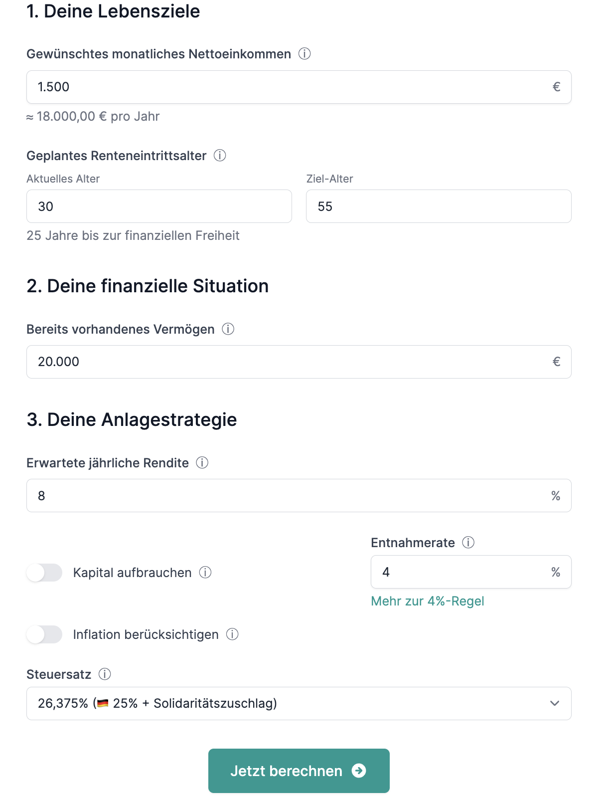 Er hilft Dir, Dein notwendiges Zielkapital zu bestimmen, das Du benötigst, um Deinen Ruhestand ausschließlich aus Deinen Kapitalerträgen finanzieren zu können. Basierend auf der "4-Prozent-Regel" (oder einer von Dir gewählten Entnahmerate) und Deinen gewünschten monatlichen Ausgaben ermittelt der Rechner die magische Zahl, die Du ansparen musst.