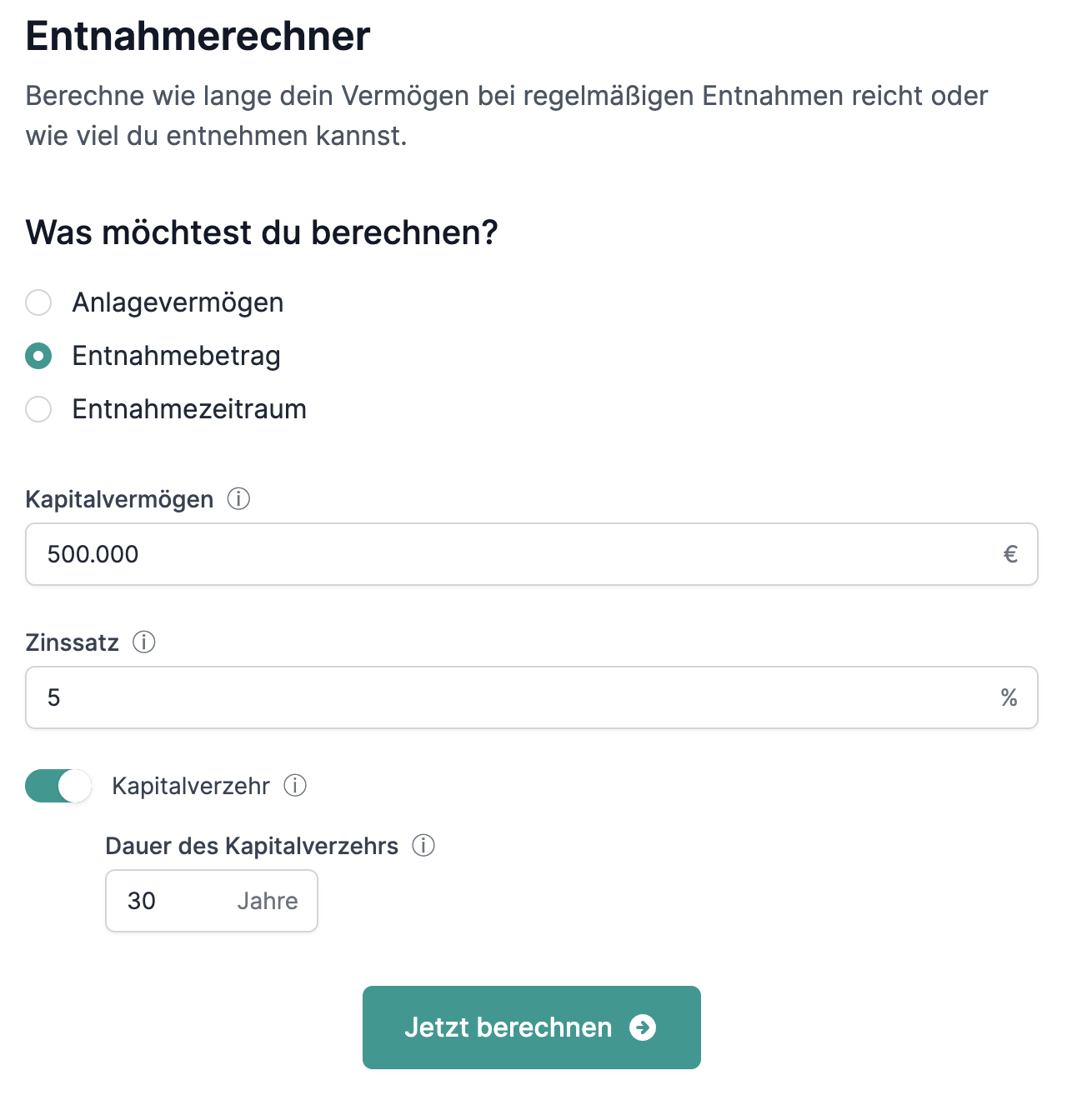 - Wenn du den Entnahmebetrag wissen möchtest dann gibst du dein Kapitalvermögen, den Zinssatz und optional wieder den Kapitalverzehr und dessen Dauer an.