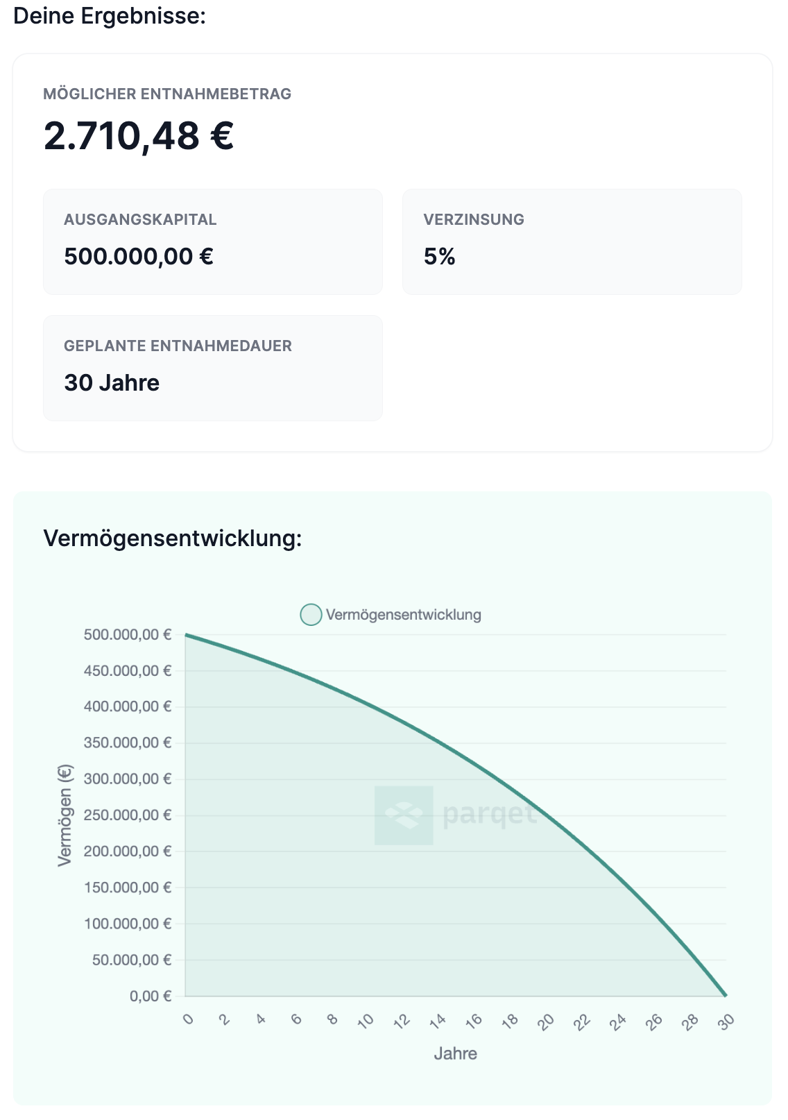 Dieser Rechner liefert eine wichtige Sicherheitsperspektive. Er hilft Dir, die Nachhaltigkeit Deiner Entnahmestrategie zu überprüfen und zu planen, welche monatlichen Beträge Du Dir realistischerweise auszahlen lassen kannst, ohne dass Dein Kapital zu schnell aufgezehrt wird.
