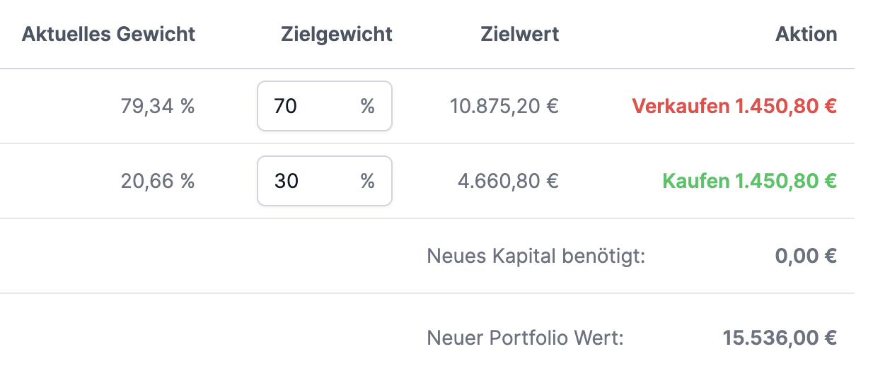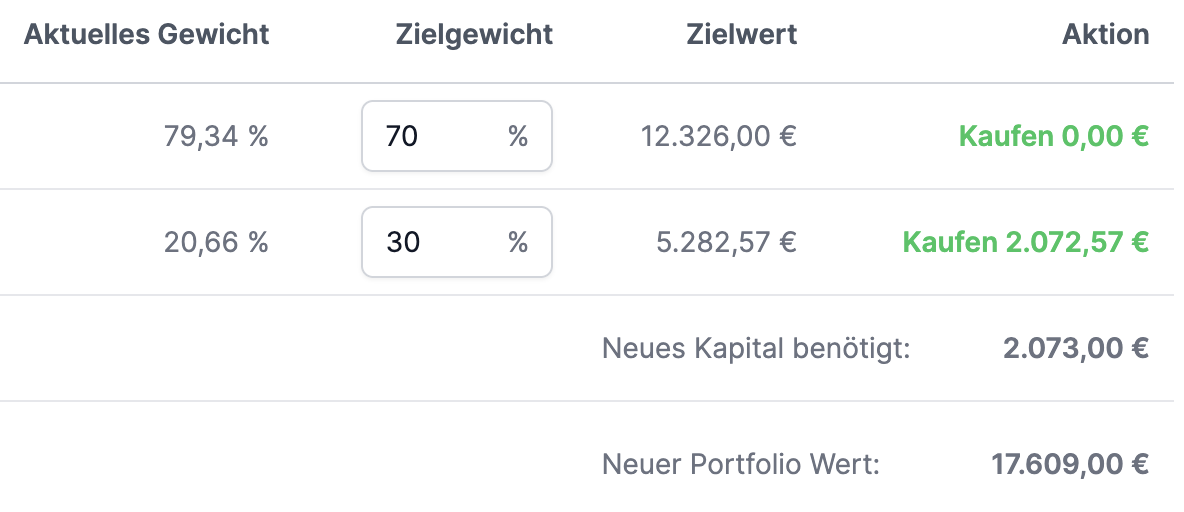 Nur neues Kapital: Wie viel neues Kapital du in welche Position du investieren musst damit du deine Zielgewichtung erreichst. In dieser Methode werden keine Anteile an bestehenden Positionen verkauft, das Rebalancing erfolgt nur über neu eingezahltes Kapital.
