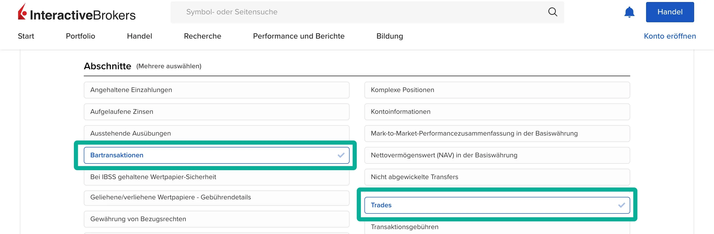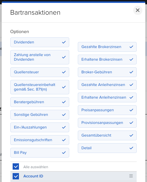 - Auswahl für den Report: Erstelle jeweils im Abschnitt Bartransaktionen und Trades einen Report.
