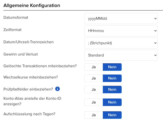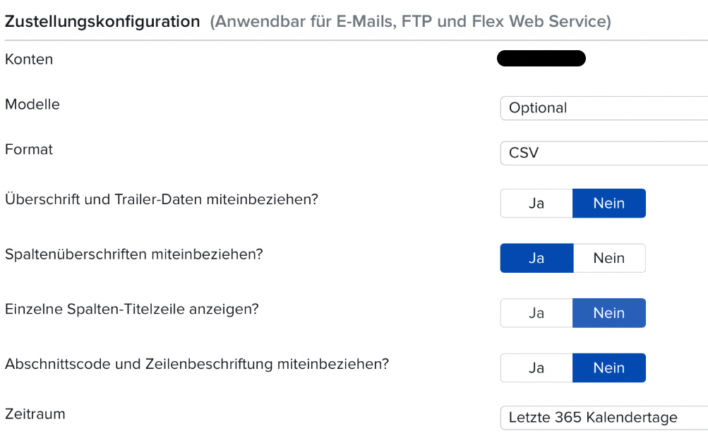 - Berichtsoptionen: Im unteren Abschnitt müssen die Formatierungen des Reports noch eingestellt werden. Achte darauf, dass die Punkte wie in den folgenden Abbildungen eingestellt sind.